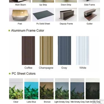 We offer 10 years warranty on our PC sheets (Polycarbonate) Embracing a blend of stylish simplicity and versatile combinations, the aluminum alloy frame stands out for its corrosion-resistant properties. Enhanced by Bayer raw material PC solid sheets and custom-profiling, the products offer effortless assembly along with robust wind resi